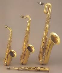 Saxophone: Though usually not considered part of the orchesta, the saxaphone is an important instrument too. It is often used in Jazz Blues and rock. It is as loud as the brass, as versatile as the strings, and as Bright as the woodwinds. That was exactly what Adolph Sax the inventor wanted. It is comes in Soprano(the highest), Alto, Tenor, Baritone and Bass the lowest). However the Baritone can get very low and the alto can get very high, so the soprano is pretty rare, and the Bass is extremely rare( it isn't even shown here).